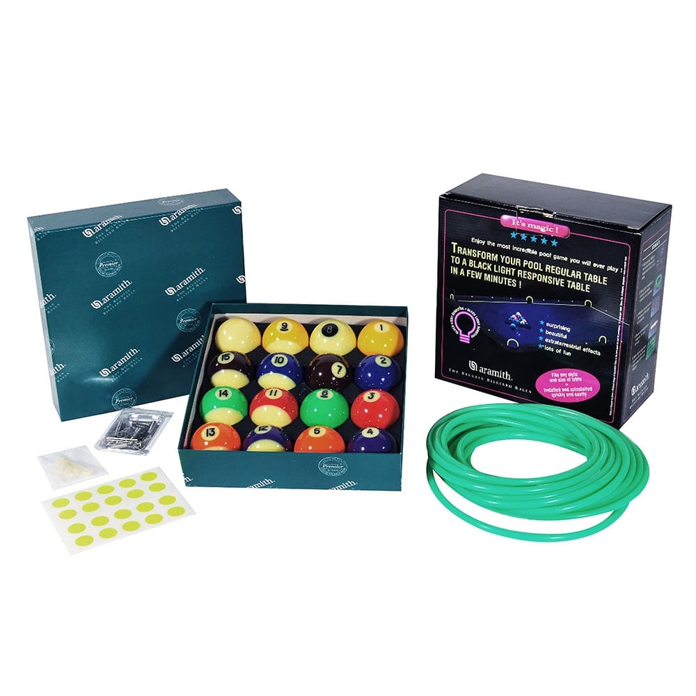 Kit de conversión de mesa fluor de Aramith que se adapta a cualquier tipo o tamaño de mesa en una mesa sensible a la luz negra que agregará magia a su juego. . . Cada kit incluye todo lo que necesita:. . Un juego completo de bolas Aramith fluo-fenólicas. Tubo de cojín reflectante con resortes metálicos. Anillos de señal más puntos de ruptura. Pegatina de rieles. . Información importante:. . Tenga en cuenta que necesitará una luz negra. ¡Una luz negra no está incluida!