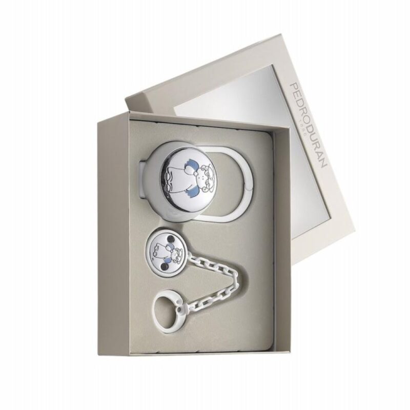 Set Querubín azul, porta chupetes + pinza . Realizada por Pedro Durán en plateado. Referencia: 07500428