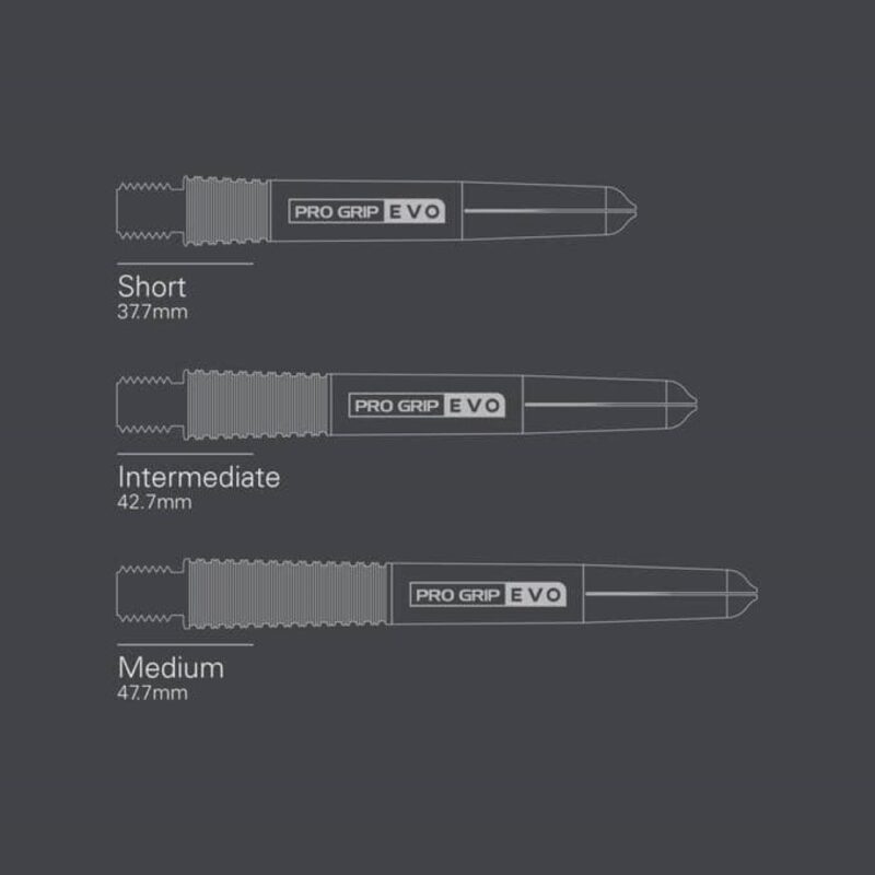 Cañas Target Pro Grip Evo Medium Rojo (47.7mm). . Marca Target Darts. Disponible en tres medidas diferentes. Talla Medium 47.7mm sin contar la rosca. Color Rojo. Contenido 3 Cañas