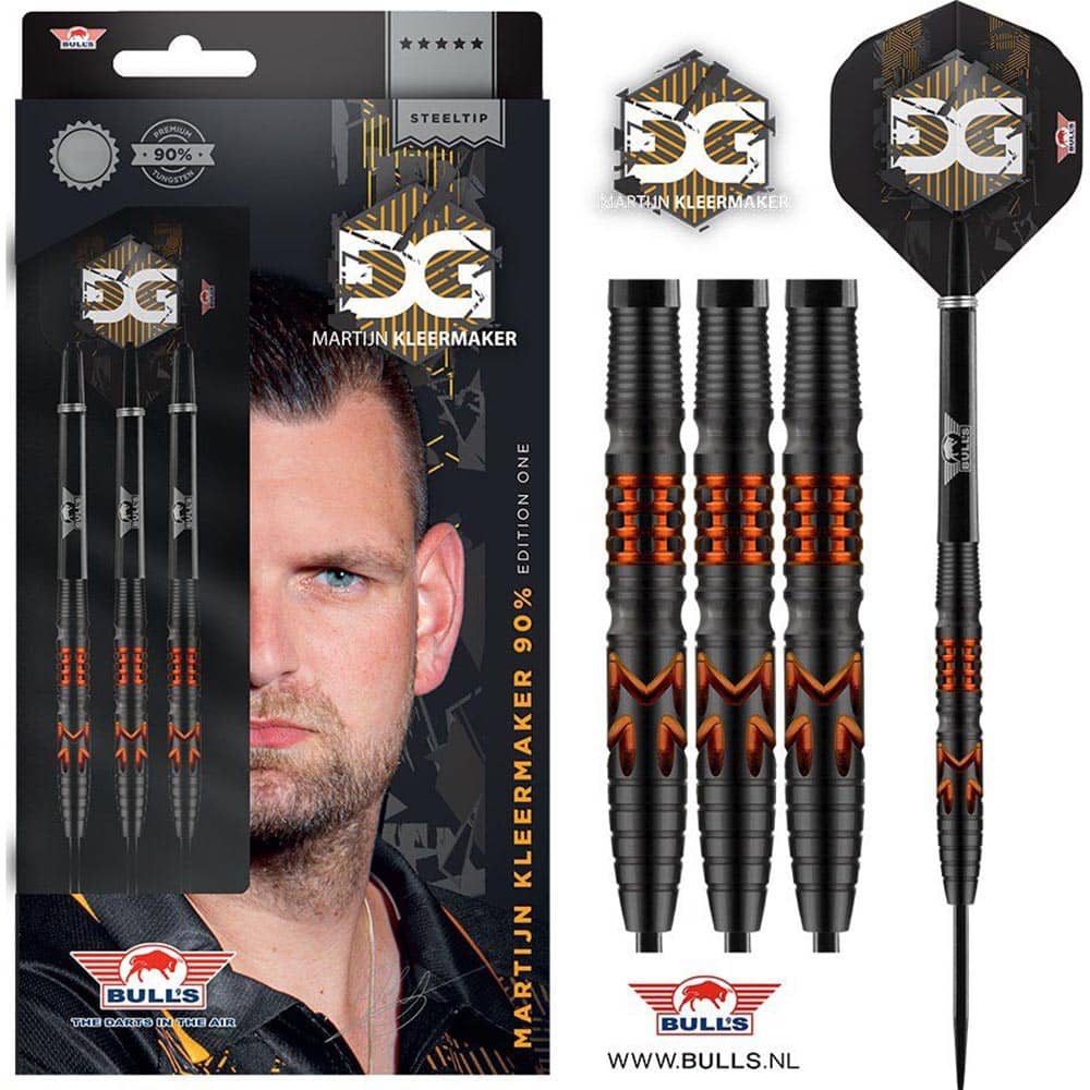 Bulls Darts Martijn Kleermaker 90% 24gr. . Marca: Bulls NL. Modelo: Martijn Kleermaker. Material: 90% Tungsteno. Peso barril: 24gr. Peso total: 25.5gr. Longitud barril: 52.0mm. Diámetro barril: 6.64mm. Tipo de punta: Metal – Steel Tip. Rosca de caña: 2ba 4mm. . El juego de dardos se compone por 1 set de 3 cuerpos Bulls Martijn Kleermaker con punta de acero, 1 set de 3 cañas Bulls Nylon Medium Negro y 1 set de 3 plumas Martijn Kleermaker Standard. . Incluye un protector para puntas de metal