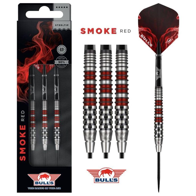 Bulls Darts Smoke Red A 90% 24gr. . Marca: Bulls NL. Material: 90% Tungsteno. Peso barril: 24gr. Peso total: 25.5gr aprox. Longitud barril: 48.9mm. Diámetro barril: 7.37mm. Tipo de punta: Metal – Steel Tip. Rosca de caña: 2ba 4mm. . El juego de dardos se compone por 1 set de 3 cuerpos Bulls Smoke Red A con punta de metal, 1 set de 3 cañas Bulls y 1 set de 3 plumas