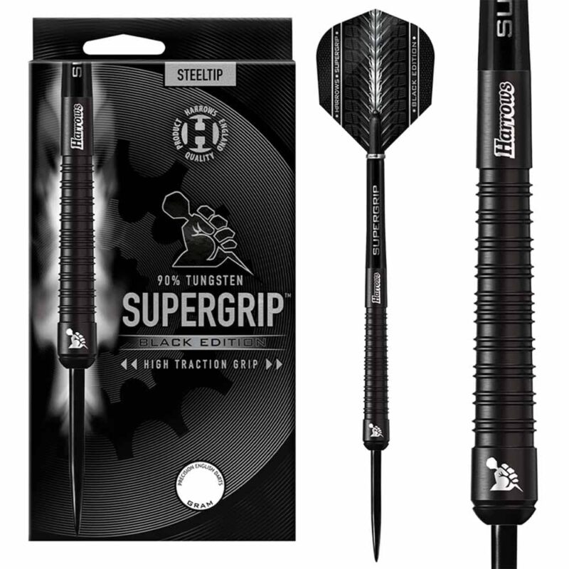 Marca: Harrows. Modelo: Supergrip Black. Cuerpo de 90% tungsteno . Cañas Supergrip. Plumas Hologram. Tipo Punta: metal. Medidas barril dardo 50mm x 7.7mm. Peso: 26g. . El producto se compone por 1 juego de 3 dardos completos de la marca Harrows modelo Supergrip Black de 26g