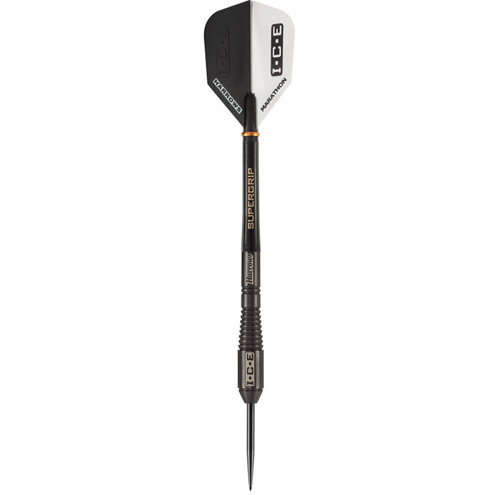 Dardos con punta de acero fabricados por las prestigiosa marca Harrows Darts, dardos diseñados y fabricados en Reino Unido. Material: 90% Tungsteno Peso 23 grs. Largo: 46.0mm sin Contar Punta Acero Grosor: 8.0mm El juego de dardos se compone por 1 juego de 3 cuerpos I.C.E Black 23g Harrows Darts, 1 juego de 3 cañas super grip, 1 juegos 3 plumas Harrows Darts.