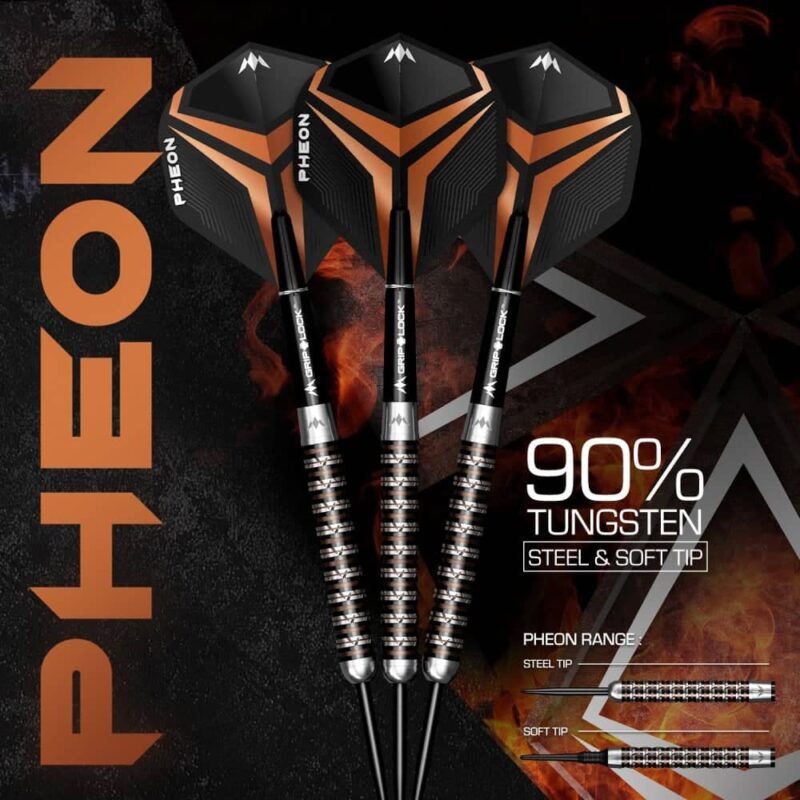Dardos Mission Pheon 90% 26gr. . Marca: Mission. Modelo: Pheon. Material: 90% Tungsteno. Largo Barril: 48.0mm. Diámetro Barril: 7.0mm. Peso barril: 26gr. Peso total: 27.5gr. Tipo de punta: Metal – Steel Tip. Rosca de caña: 2ba 4mm. . El juego de dardos se compone por 1 set de 3 cuerpos de dardos Mission Pheon con puntas de acero, 1 set de 3 cañas y 1 set de 3 plumas.