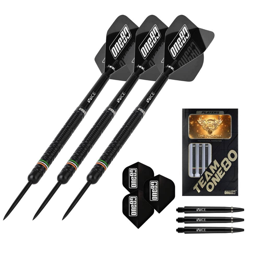 Marca: One80. Modelo: Mahi Bosmia. Longitud del barril: 54.60mm. Diámetro del barril: 6.10mm. Peso barril: 22gr. Material: 90% Tungsteno. Tipo de punta: Acero – Steel Tip. Rosca Caña: 2ba 4mm. . El juego de dardos One80 Mahi Bosmia se compone por 1 set de 3 cuerpos con punta de acero, 1 set de 3 cañas Vice y 1 set de 3 plumas.