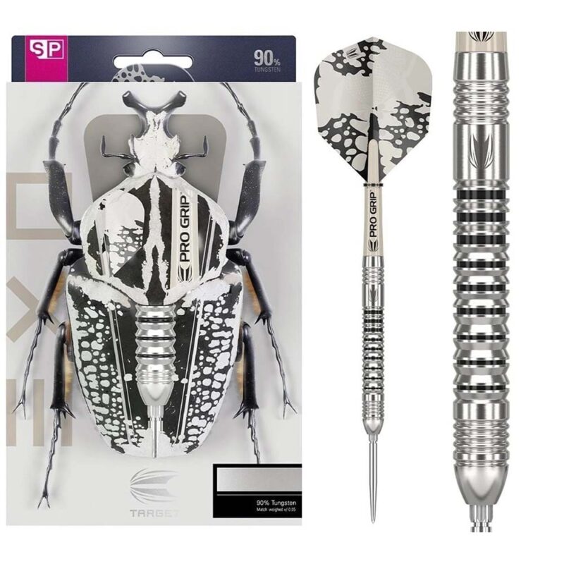 Marca :Target Darts. Modelo: Exo 90% SPO2. Peso: 23g. Tipo punta: Swiss Point. Material: 90%. Largo Barril: 50.50mm. Grosor: 6.50mm. . El producto se compone por 1 set de 3 cuerpo modelo Exo 90% SPO2, 1 set de 3 cañas Target Darts, 1 set de 3 plumas y set de 3 puntas Swiss Point.