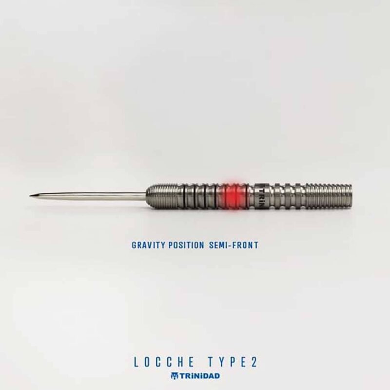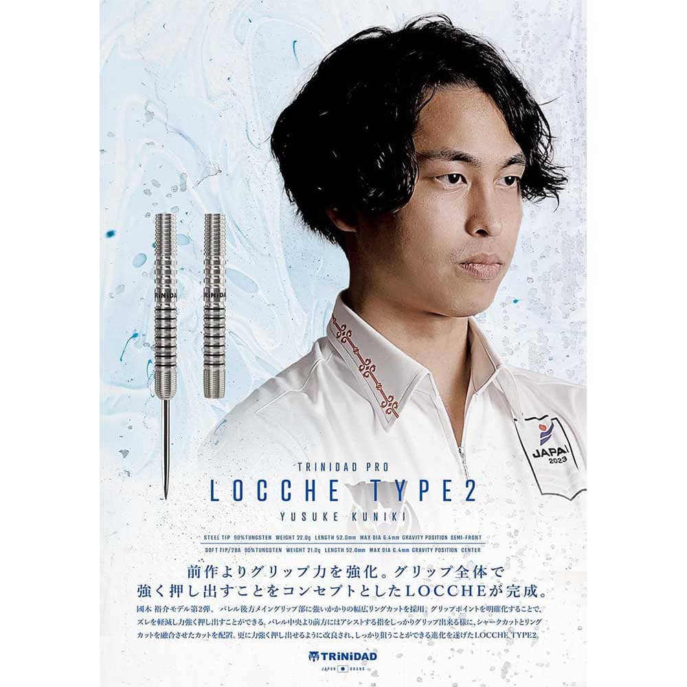 Marca: Trinidad. Diseñado: Yusuke Kuniki. Modelo: Locche 2. Peso del barril: 22gr. Material: 90% Tungsteno. Tipo de punta: Metal. Longitud barril: 52.0mm. Diámetro barril: 6.4mm. . El juego de dardos Locche 2 Yusuke Kuniki se compone por 1 set de 3 cuerpos , 1 set de 3 plumas Condor y 1 set de 3 puntas 2ba