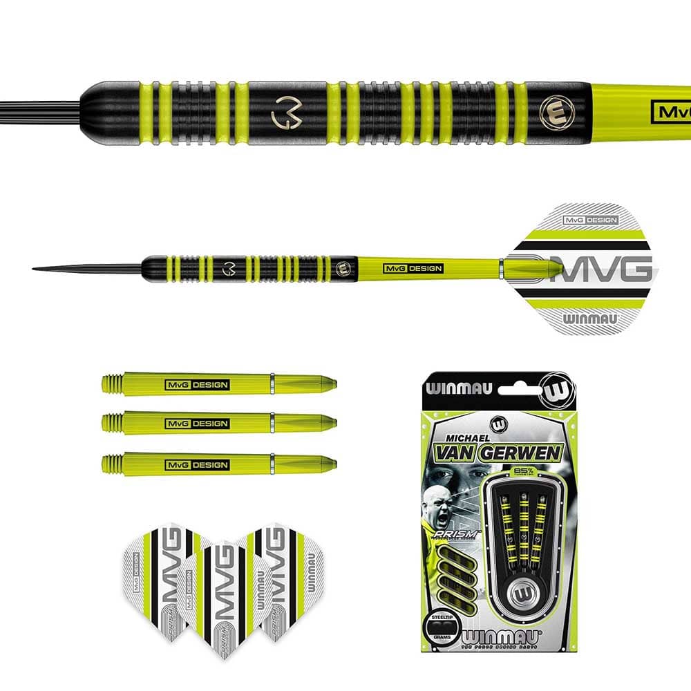 Marca: Winmau. Modelo: MVG 85% Pro Series. Largo total: 50.8mm. Diámetro: 6.60mm. Peso total: 23g. Tungsteno: 85%. Tipo punta: Metal steel tip. . El producto se compone por 1 set de 3 cuerpos, 1 set de 3 cañas y 1 set de 3 plumas de la serie MVG