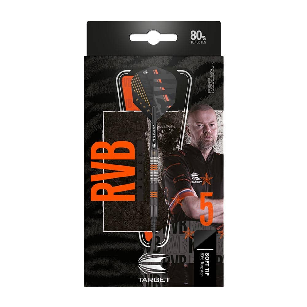 Marca: Target. Modelo: Raymond Van Barneveld RVB Black Edition. Longitud: 52.0mm. Diámetro: 8.0mm. Peso del barril: 16.2gr aprox. Peso total: 18gr. Material: 80% Tungsteno . Tipo de punta: Plástico con rosca 2ba 4mm. . Incluye una funda pequeña de cuero negro Target.. . El juego se compone por 1 set de 3 cuerpos de dardos Target Raymond Van Barneveld RVB, 1 set de 3 cañas Pro Grip corta y 1 set de 3 plumas RVB No.6 Pro.Ultra, 3 puntas Pixel tip 2ba.