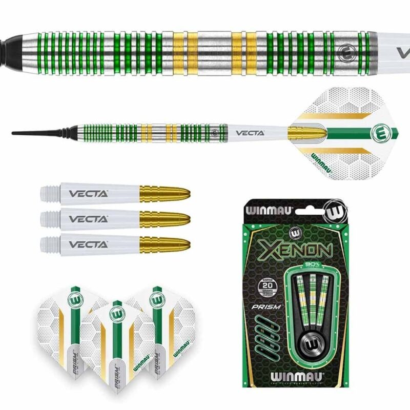 Modelo: Xenon . Distribución del peso: Centro. Perfil del cañón: Paralelo. Perfil frontal: Conico. Largo total: 50.8mm. Diámetro: 6.4mm. Peso total: 20g. Peso del cuerpo:18g. Tungsteno: 90%. . El dardos Xenon se compone por 1 set de 3 cuerpos, 1 set de 3 cañas y 1 set de 3 plumas